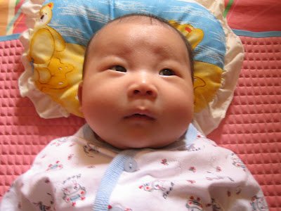 *follows with her eyes a moving person or a toy dangled over her